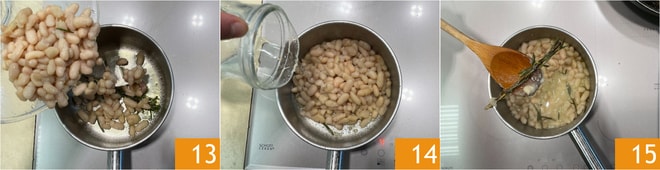 Dès que l'huile est tiède, ajoutez les cannellini que vous aurez préalablement rincés 13. Faites-les revenir brièvement, puis versez un peu d'eau 14 et faites cuire pendant une dizaine de minutes, juste le temps de les parfumer. En fin de cuisson, enlevez l'ail et le romarin 15.