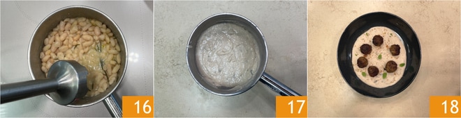 Mixez avec un mixeur plongeant 16 pour obtenir une consistance crémeuse 17. Passez rapidement les boulettes sur du papier absorbant pour éliminer l'excès d'huile, puis déposez-les sur la crème de cannellini. Garnissez avec une pincée de coriandre, de paprika et quelques feuilles de menthe : vos boulettes avec crème de cannellini sont prêtes à être servies 18 !