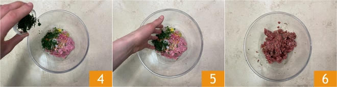 Ajoutez également le persil et la menthe hachés 4. Pétrissez avec les mains 5 pour amalgamer le mélange 6, puis ajustez le sel.