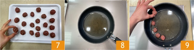 Formez des boulettes de la taille d'une noix et transférez-les sur un plateau 7. Chauffez l'huile dans une poêle 8 et déposez les boulettes à l'intérieur 9.