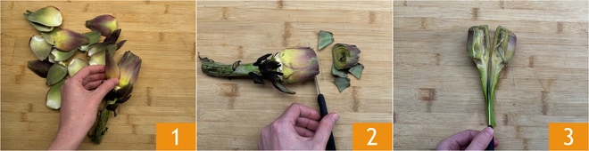 Pour préparer les boulettes d'artichauts à la sauce, commencez par vous occuper du Comment nettoyer les artichauts. Enlevez les feuilles extérieures dures 1, puis coupez la pointe 2. Épluchez la tige et coupez les artichauts en deux 3.