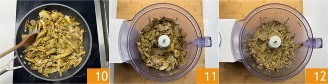 Enlevez le couvercle et laissez sécher pendant 4-5 minutes 10, en mélangeant le moins possible pour que les artichauts aient une belle couleur. Laissez tiédir, vous pouvez retirer l'ail ou le laisser selon vos goûts. Transférez le tout dans un mixeur 11 et mixez jusqu'à obtenir un mélange homogène 12.