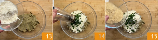 Dans un bol, mettez les artichauts mixés et ajoutez le pecorino 13, le persil haché et assaisonnez de sel et de poivre 14. Ajoutez la chapelure 15 et pétrissez.
