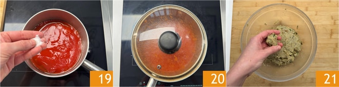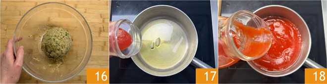 Vous devez obtenir un mélange homogène 16. Laissez reposer au réfrigérateur pendant 1 heure. En attendant, préparez la sauce. Dans une casserole, faites revenir l'ail quelques minutes, puis ajoutez la purée de tomates 17 et un peu d'eau pour rincer le récipient 18.