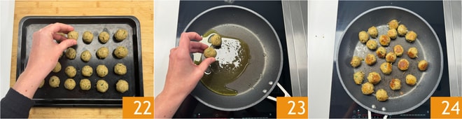 Disposez-les au fur et à mesure sur un plateau 22. Dans une poêle antiadhésive, versez un filet d'huile, ajoutez les boulettes 23 et faites-les dorer pendant 5 minutes, en déplaçant la poêle pour les cuire sur tous les côtés 24.