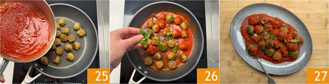 Ajoutez la sauce 25 et laissez les boulettes s'imprégner quelques minutes. Complétez avec du basilic 26 et servez. Vos boulettes d'artichauts à la sauce sont prêtes à être dégustées 27 !