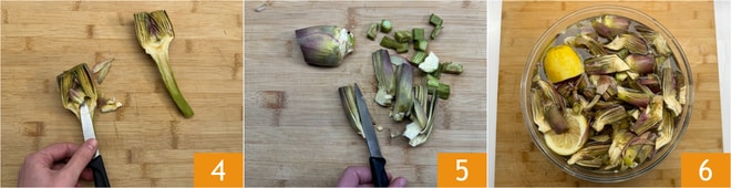 Enlevez le foin intérieur 4. Coupez les cœurs en quartiers et les tiges en rondelles 5. Au fur et à mesure que vous les nettoyez, plongez-les dans de l'eau acidulée 6 pour éviter qu'ils ne noircissent.