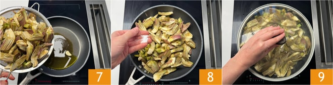 Dans une poêle, versez l'huile, ajoutez l'ail et faites revenir quelques minutes. Ajoutez les artichauts bien égouttés 7 et assaisonnez de sel 8. Mélangez, couvrez avec un couvercle 9 et faites cuire à feu moyen pendant 15 minutes, en mélangeant de temps en temps.