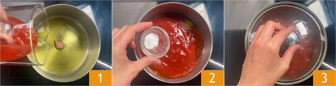 Pour réaliser les boulettes d'aubergines à la sauce, commencez par la sauce tomate : dans une petite casserole, faites chauffer l'huile avec une gousse d'ail en chemise, puis versez la purée 1 et autant d'eau que nécessaire pour rincer le récipient, puis ajoutez le sel 2. Mélangez et faites cuire à feu doux avec le couvercle pendant 30-40 minutes 3.