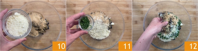 Ajoutez aussi le Grana Padano DOP râpé 10 et le persil haché 11, puis ajustez le sel et le poivre. Pétrissez avec vos mains pour obtenir une pâte moelleuse et compacte 12.