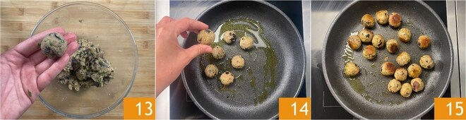 Formez des petites boules de la taille d'une noix environ ; avec ces quantités, vous en obtiendrez une vingtaine 13. Pour vous aider, vous pouvez mouiller vos mains. Chauffez un autre filet d'huile dans la même poêle où vous avez cuit les aubergines, puis déposez les boulettes 14 et faites-les dorer environ 5 minutes, en remuant la poêle pour les tourner de tous les côtés 15.