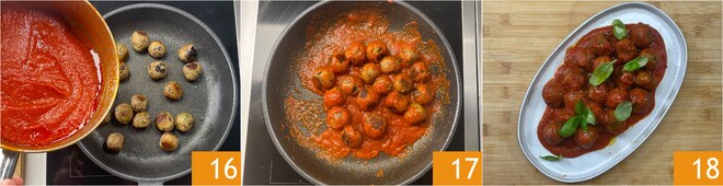 Lorsqu'elles sont dorées uniformément, ajoutez la sauce tomate 16 et faites sauter le tout brièvement pour amalgamer les boulettes au condiment 17. Garnissez de feuilles de basilic et servez vos boulettes d'aubergines à la sauce 18 !