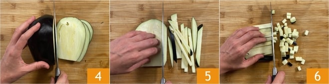 En attendant, préparez les aubergines : coupez-les d'abord en tranches 4, puis en bâtonnets 5 et enfin en cubes 6.