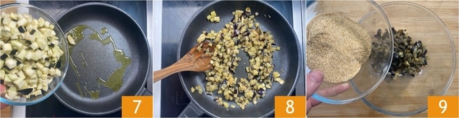 Dans une poêle antiadhésive, faites revenir la gousse d'ail écrasée avec un filet d'huile, puis ajoutez les aubergines 7 et le sel. Faites dorer les aubergines à feu vif pendant environ 10 minutes, en remuant souvent 8. Lorsqu'elles sont tendres et colorées, transférez les aubergines dans un bol et laissez tiédir. Une fois tiédies, ajoutez la chapelure 9.
