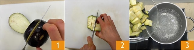 Pour préparer les boulettes d'aubergines au four, lavez les aubergines, séchez-les et coupez-les d'abord en tranches 1 puis en dés 2. Ébouillantez-les dans de l'eau salée 3 pendant environ 5 minutes.