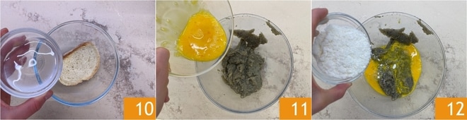 Mouillez le pain avec très peu d'eau 10. Mettez les aubergines dans un saladier avec les œufs battus 11 et le pecorino râpé 12.