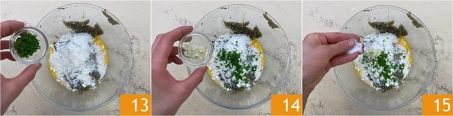 Ajoutez également le persil haché 13, le concentré de tomate, l'ail 14, le sel 15 et le poivre.