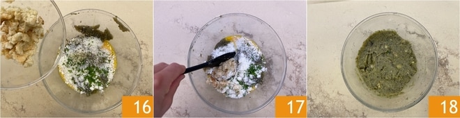 Ajoutez le pain rassis bien pressé 16 et mélangez 17. Pétrissez avec les mains si nécessaire jusqu'à obtenir une pâte homogène 18. Couvrez la pâte avec un film plastique et laissez reposer une demi-heure au réfrigérateur.