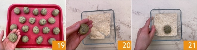 Dans un bol, mélangez la chapelure avec le Parmesan. Après le temps de repos, formez des boulettes de 35 g chacune 19 et passez-les une à une dans le mélange de pain et de fromage 20 21.