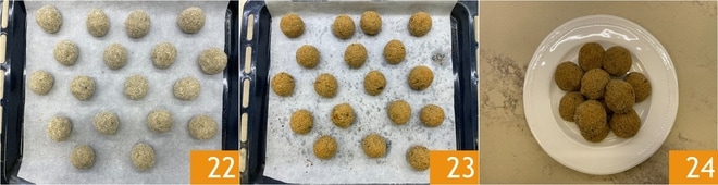 Disposez-les au fur et à mesure sur une plaque recouverte de papier sulfurisé 22 ; avec ces quantités, vous devriez en obtenir environ 36. Faites cuire à 200° dans un four statique préchauffé pendant 30 minutes. Lorsqu'elles sont bien dorées, sortez les boulettes d'aubergines du four 23 et servez-les chaudes 24 !