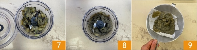 Mettez-les dans un mixeur 7 et mixez rapidement jusqu'à obtenir une crème 8. Transférez dans une passoire avec une gaze et laissez égoutter à nouveau 9.