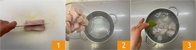 Pour préparer les boulettes d'espadon à la sauce, découpez d'abord le morceau d'espadon, déjà débarrassé des arêtes et de la peau, en dés 1. Plongez-le dans de l'eau bouillante légèrement salée 2 avec les feuilles de laurier 3.