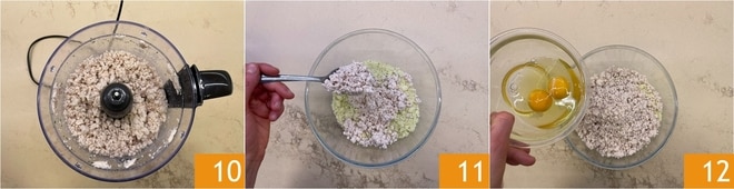 Mixez également l'espadon 10 et transférez-le dans le bol avec le pain 11. Ajoutez ensuite les œufs 12.