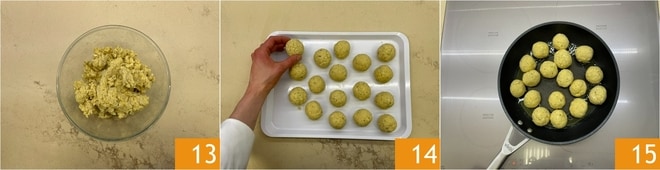 Pétrissez bien jusqu'à obtenir un mélange homogène 13. Formez environ 17 boulettes en prélevant une portion de pâte et en lui donnant une forme ronde 14. Chauffez une poêle avec un filet d'huile et déposez les boulettes à l'intérieur 15.