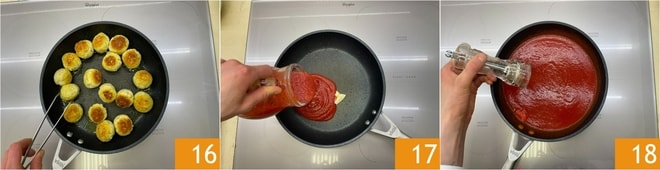 Faites bien dorer de tous les côtés 16, puis transférez-les dans une assiette. Dans la même poêle, ajoutez une gousse d'ail et la purée de tomates 17. Salez et poivrez 18. Laissez cuire quelques minutes et, dès que la sauce commence à frémir, retirez la gousse d'ail.