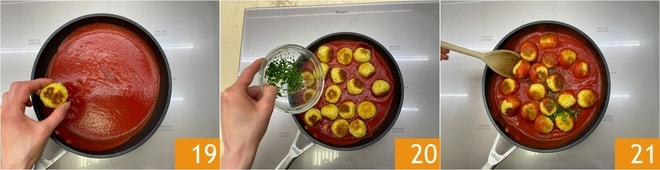 Plongez les boulettes dans la sauce 19, parfumez avec du persil haché 20 et mélangez délicatement 21.