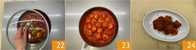 Couvrez avec un couvercle 22 et poursuivez la cuisson pendant environ 20 minutes, en remuant de temps en temps. Dès que les boulettes sont prêtes 23, dressez-les et garnissez-les de persil haché. Servez vos boulettes d'espadon à la sauce bien chaudes 24 !