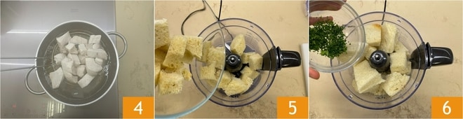 Faites cuire pendant 5 minutes, puis égouttez-le 4. Coupez le pain en morceaux et transférez-le dans le mixeur 5 ; ajoutez le persil haché 6 et la gousse d'ail.