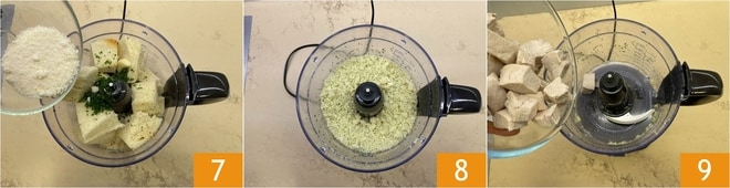 Ajoutez également le Grana Padano DOP râpé 7, une pincée de sel et mixez le tout jusqu'à obtenir des miettes 8. Transférez ensuite dans un grand bol et versez l'espadon dans le mixeur 9, sans le laver.