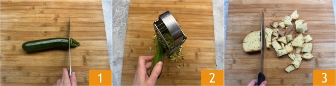 Pour préparer les boulettes de courgettes au four, commencez par laver les courgettes et en couper une extrémité 1, puis râpez-les avec une râpe à gros trous 2 et mettez de côté. Si vos courgettes semblent particulièrement aqueuses, placez-les sur une passoire avec un poids dessus pour qu'elles perdent leur eau de végétation. Ensuite, coupez le pain en cubes 3.