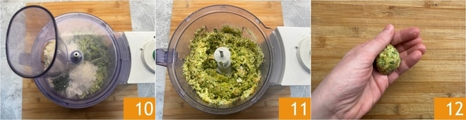 Fermez le mixeur 10 et mixez encore brièvement, juste le temps de mélanger 11. Prélevez maintenant 18 g de pâte, compactez-la entre vos mains légèrement huilées et façonnez de petites boulettes rondes 12.