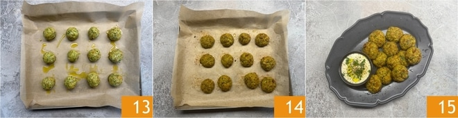 Disposez-les sur une plaque recouverte de papier sulfurisé et arrosez-les d'un filet d'huile 13. Faites-les cuire dans le milieu du four statique à 200° pendant 20 minutes. Puis placez la plaque un peu plus haut et poursuivez la cuisson pendant 8-10 minutes supplémentaires, pour une dorure parfaite 14. Servez vos boulettes de courgettes au four tièdes ou chaudes, avec une pincée de sel sur le dessus et de la sauce yaourt à votre convenance 15.