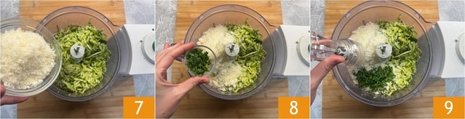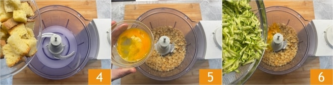 Transférez-le dans le bol du mixeur 4 et mixez-le pour obtenir des miettes. Ajoutez l'œuf 5 et les courgettes râpées 6.