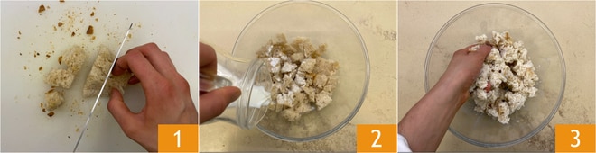 Pour préparer les boulettes cacio e pepe avec fondue, commencez par couper grossièrement le pain rassis 1, transférez-le dans un bol et arrosez-le avec le lait 2. Laissez tremper pendant 10 minutes, jusqu'à ce que le pain soit ramolli. Essorez-le bien pour éliminer l'excès de lait 3 et mettez de côté.