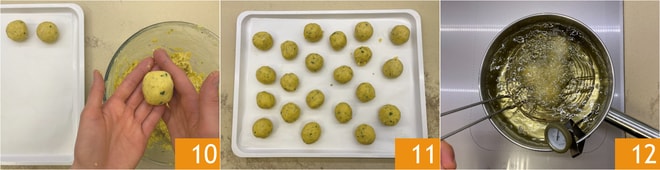 Avec les mains légèrement humides, formez des boulettes d'environ 4-5 cm de diamètre 10 et disposez-les sur un plateau 11. Faites chauffer l'huile de graines à une température de 170°C et faites frire quelques boulettes à la fois, pour ne pas trop baisser la température de l'huile 12.