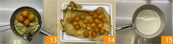 Lorsqu'elles sont croustillantes et dorées, égouttez-les 13 et disposez-les sur du papier absorbant pour éliminer l'excès d'huile 14. À ce stade, préparez la fondue : dans une casserole, versez la crème et chauffez à feu doux, sans atteindre l'ébullition 15.