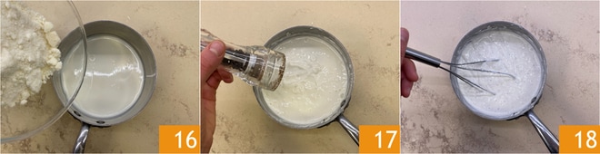 Éteignez le feu, ajoutez le Pecorino romano râpé 16 et mélangez continuellement jusqu'à obtenir une crème lisse et homogène. Si elle est trop épaisse, vous pouvez ajouter un peu de crème fraîche. Poivrez 17 et mélangez à nouveau 18.