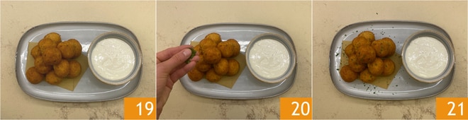 Disposez les boulettes sur un plat de service et servez-les avec la fondue à part 19. Complétez avec du persil haché 20 et un autre tour de moulin à poivre noir. Vos boulettes cacio e pepe avec fondue sont prêtes à être dégustées 21 !