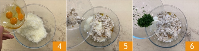 Dans un bol, mettez le pecorino romano AOP, ajoutez les œufs 4, le pain 5 et le persil haché 6.