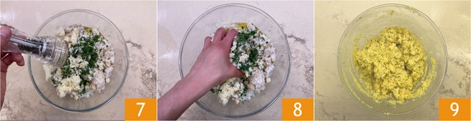 Assaisonnez de sel et de poivre 7. Pétrissez 8 jusqu'à obtenir un mélange homogène 9. Si le mélange est trop mou, vous pouvez ajouter un peu de chapelure.