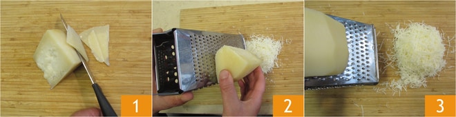 Pour préparer les boulettes de fromage, enlevez la croûte des fromages 1 et râpez-les avec une râpe à mailles fines 2 3. Mettez de côté les fromages et occupez-vous du pain.