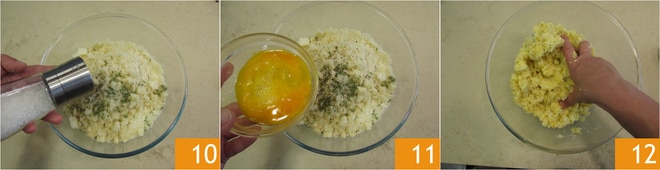 Salez 10, poivrez et enfin ajoutez les œufs 11. Pétrissez avec les mains jusqu'à obtenir un mélange assez compact 12.