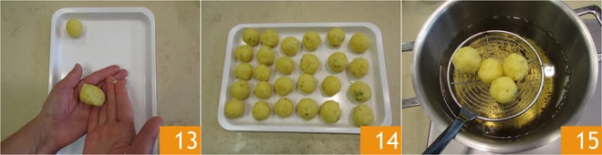 Formez des petites boules d'environ 20 g chacune 13. Avec ces quantités, vous obtiendrez 36 boulettes 14. Maintenant, faites-les frire dans l'huile déjà chaude à 170° 15. Faites frire quelques boulettes à la fois car elles ont tendance à coller pendant la cuisson, et la température baisserait.