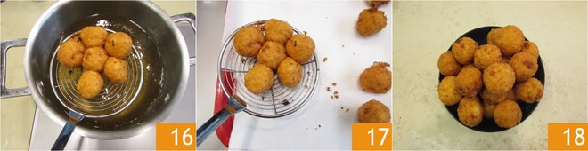Une fois dorées, cela prendra quelques minutes, égouttez-les 16 et transférez-les sur du papier absorbant 17. Servez les boulettes de fromage bien chaudes 18.