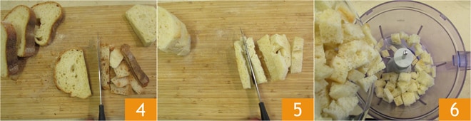 Retirez la croûte du pain 4 et coupez la mie en cubes 5, puis mixez avec un robot 6.