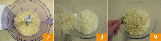 Une fois obtenues les miettes 7, mélangez-les aux fromages 8 et aromatisez avec le thym 9.